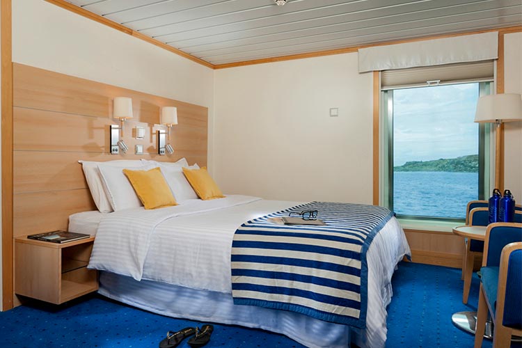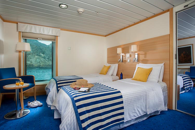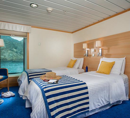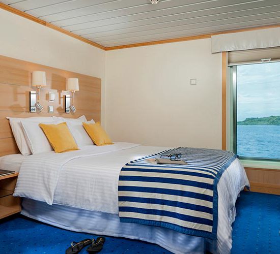 Cabins have been designed to meet all guests’ comfort, with top to floor windows for a private observation of the Galapagos Islands. Ideal for families with connected cabins.